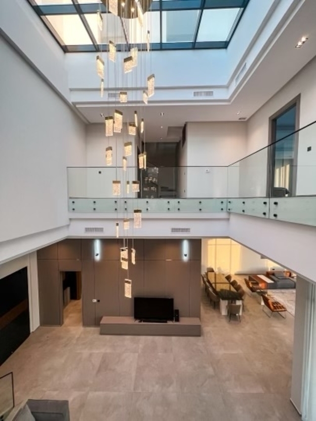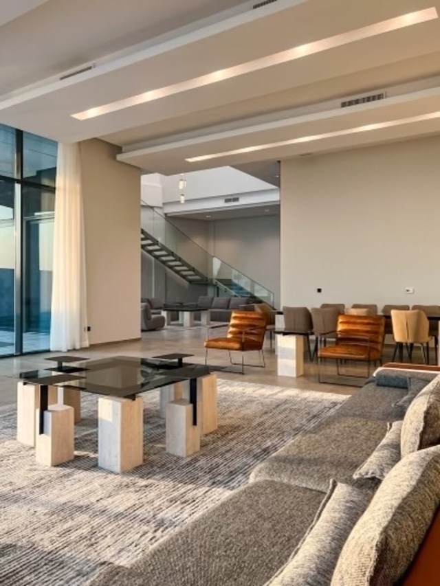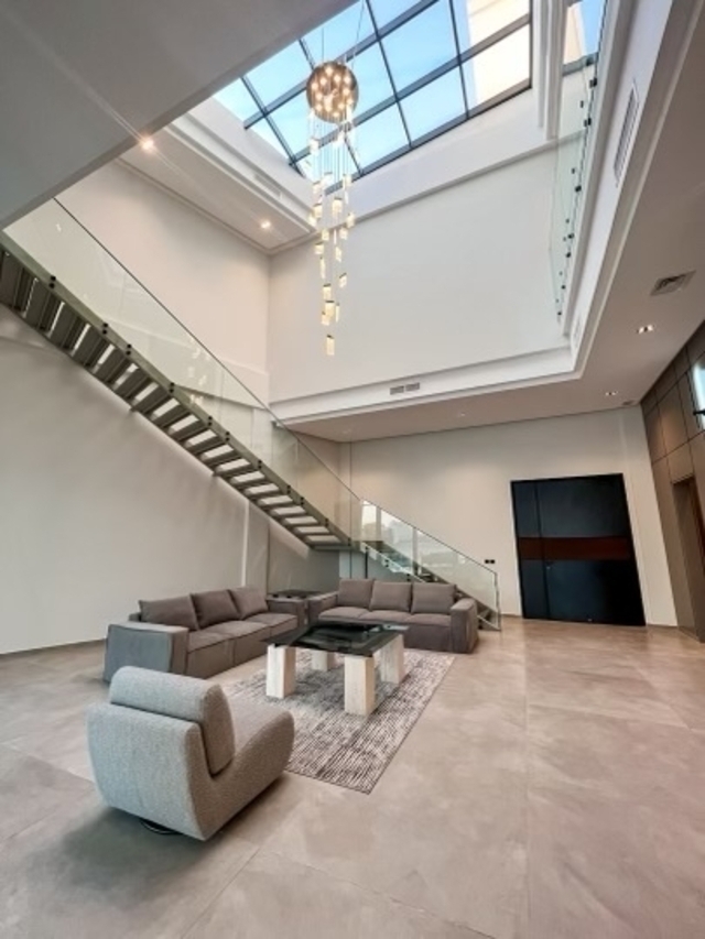 الدور الارضي صالتين كبار مفتوحين على بعض مقابل الخور والمسبح بسقف عاليه بنظام سكايلايت + صاوله طعام تكفى ١٠ اشخاص + مغاسل للضيوف مع حمام + مسبح خارجي بحجم ٥ في ٥ بعمق متدرج لغايه متر و٥٥ + مصعد